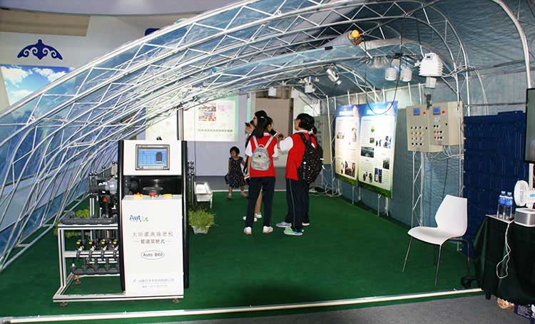 在展區中間,一座名為“新型裝配式內保溫日光溫室&陽光畜牧棚舍”格外引人注目。這個外表是蔬菜暖棚的龐然大物,里面設置了LED智能顯示器、智能放風卷簾控制系統、營養液施肥機,還擺放著無土栽培綠色蔬菜樣品供觀眾觀賞。
