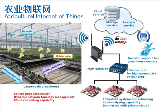 農業生產監控物聯網,主要指利用傳感器技術采集和獲取農業生產環境各要素信息,如種植業中的光照、溫濕度,二氧化碳濃度、土壤肥力、土壤含水量等參數,水產養殖業中的酸堿度、溶解氧、氨、氮、濁度和電導率,畜禽養殖業中的氨氣、二氧化硫、粉塵等有害物質濃度等參數,通過對采集信息的分析決策來指導農業生產環境的調控,實現種養殖業的高產。