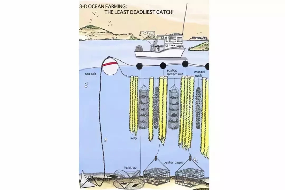 布倫·史密斯(BrenSmith)想要創造數千個體面的工作,改變我們從海洋中獲取食物的方式,降低氣候變化和海洋退化的影響,這促使他提出了“小規模的3D海洋農場”的設想。他在寫給《國家地理》雜志的文章中表示:這一“3D海洋農場”的基礎設施非常簡單——海藻、扇貝和貽貝長在浮動的繩子上,上面堆放牡蠣和蛤籠。從這些作物將用于海洋農民來生產糧食、肥料、動物飼料、醫藥、化妝品、生物燃料和其他副產品。