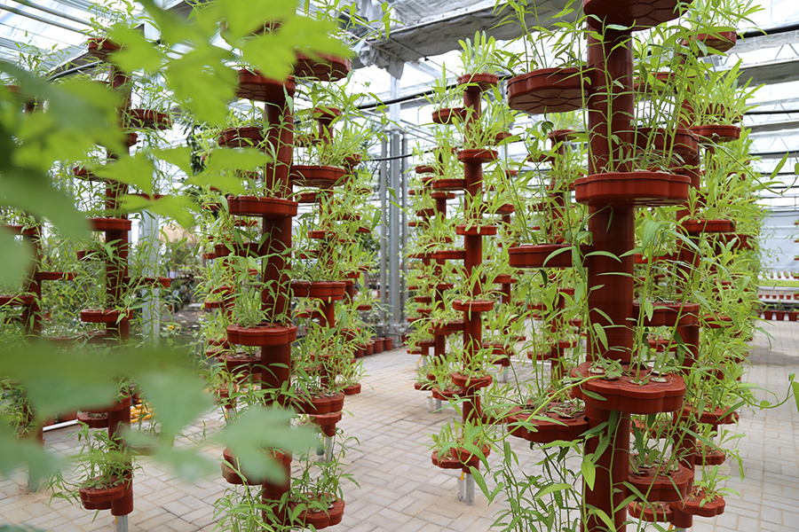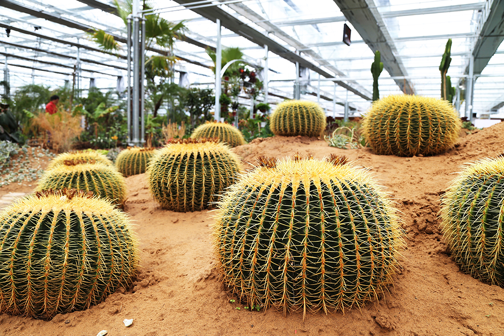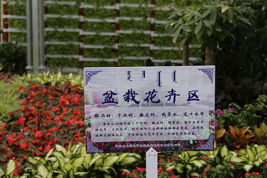 智能溫室大棚占地約6060平方米,分為一號廳和二號廳。其中一號廳是新建的有錯層的玻璃溫室,分為盆栽花卉、盆栽果樹區、沙生植物區、熱帶風情區、家庭園藝區等功能區。二號廳由舊溫室改造而成,頂部為陽光板,四周立面為玻璃,配置了智能控制系統,有無土栽培區、育苗區、采栽體驗區等功能區。智能溫室全部配備了內、外保溫系統,冬季保溫,比普通溫室節能。溫棚內移動苗床一次育苗30萬株,可供給巴彥霍德406座溫棚,一定程度上帶動了農民增收。不論是熱帶植物、水果還是沙漠植物,在這里你可以一覽無余,一年四季感受綠色勃勃生機。