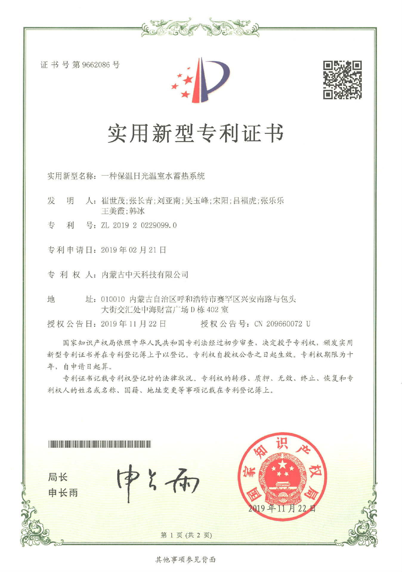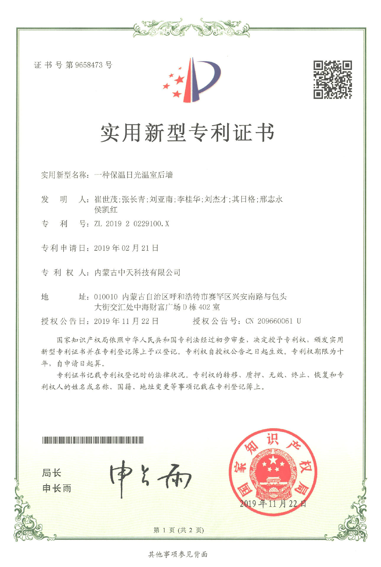 2019年11月22日,公司經(jīng)過長期對日光溫室的研究、實(shí)驗(yàn)、改進(jìn)終于又獲得了2項(xiàng)實(shí)用新型專利證書,分別是一種保溫日光溫室后墻和一種保溫日光溫室水蓄熱系統(tǒng)。一種保溫日光溫室后墻是采用全鋼骨架,具有結(jié)構(gòu)輕便、采光角度科學(xué)合理和承載力強(qiáng)等特點(diǎn),一種保溫日光溫室水蓄熱系統(tǒng)是由蓄熱水箱組成,具有保溫性能好、蓄放熱量大等特點(diǎn)。